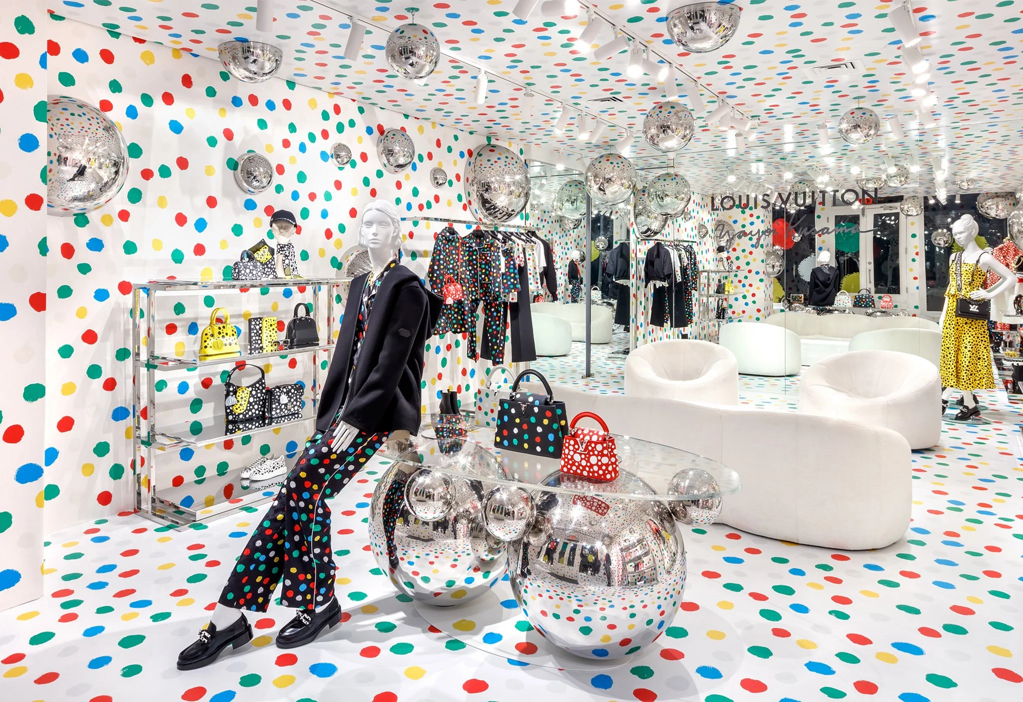 The wow factor manifests globally at LV retail locations, starting from the flagship LV Champs-Élysées location that has a gigantic animatronic Kusama emerging from behind the building painting the windows with Polkadots. In London, Harrods traditional exterior also received the Polka-dot treatment & 22 windows filled with unique anamorphic displays. NYC LV locations have both been transformed into white canvas' giving birth to a fun polka-dot frenzy & in Harajuku her signature & bold yellow & black polka-dots dazzle & delight.
