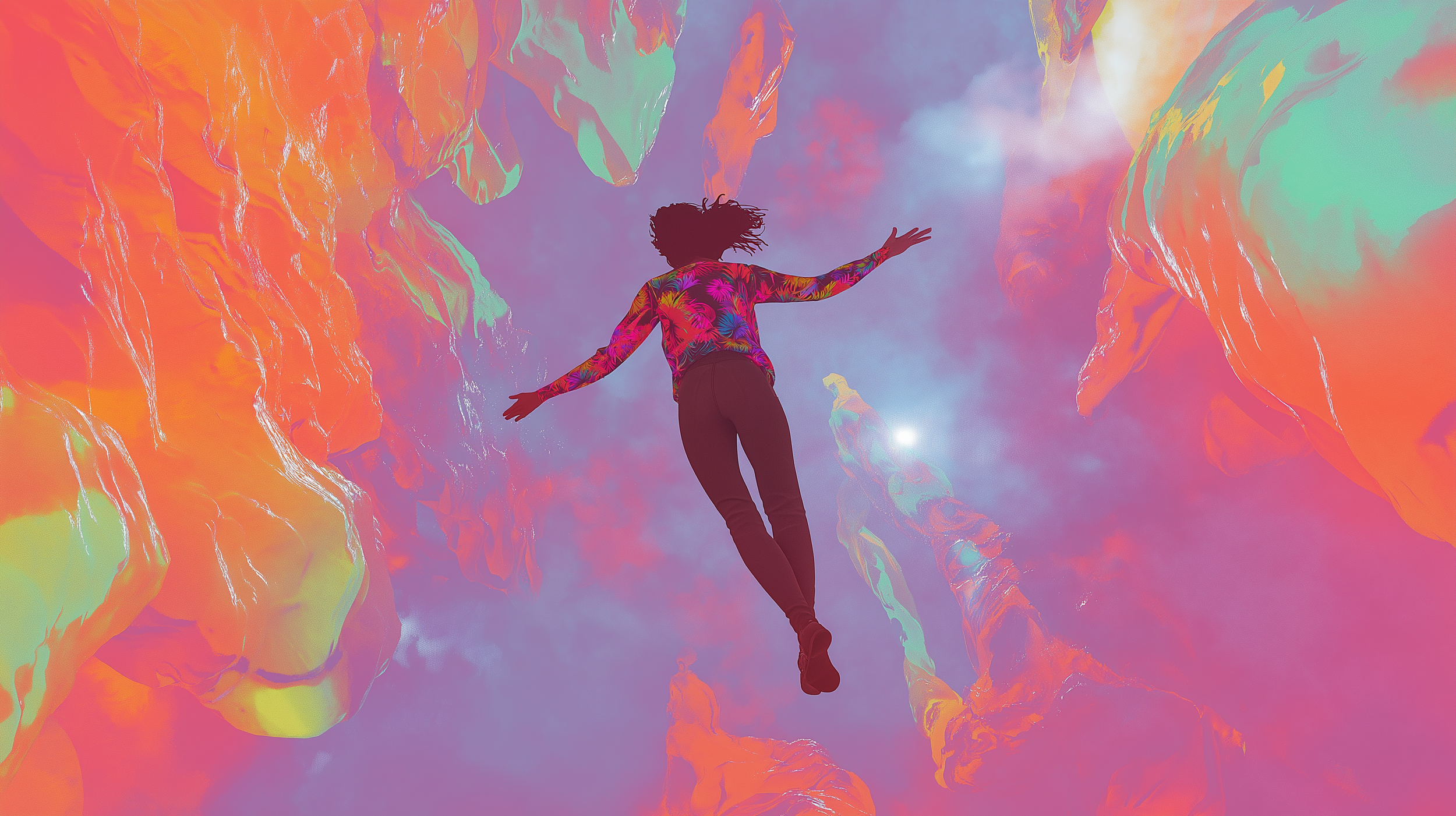 Gravity inverts. You fall upwards into a sea of sentient accessories. Scarves with PhD-level intelligence debate the philosophy of style with earrings that can hear the music of the spheres. A pair of quantum-entangled socks discusses the nature of existence with itself across parallel universes.